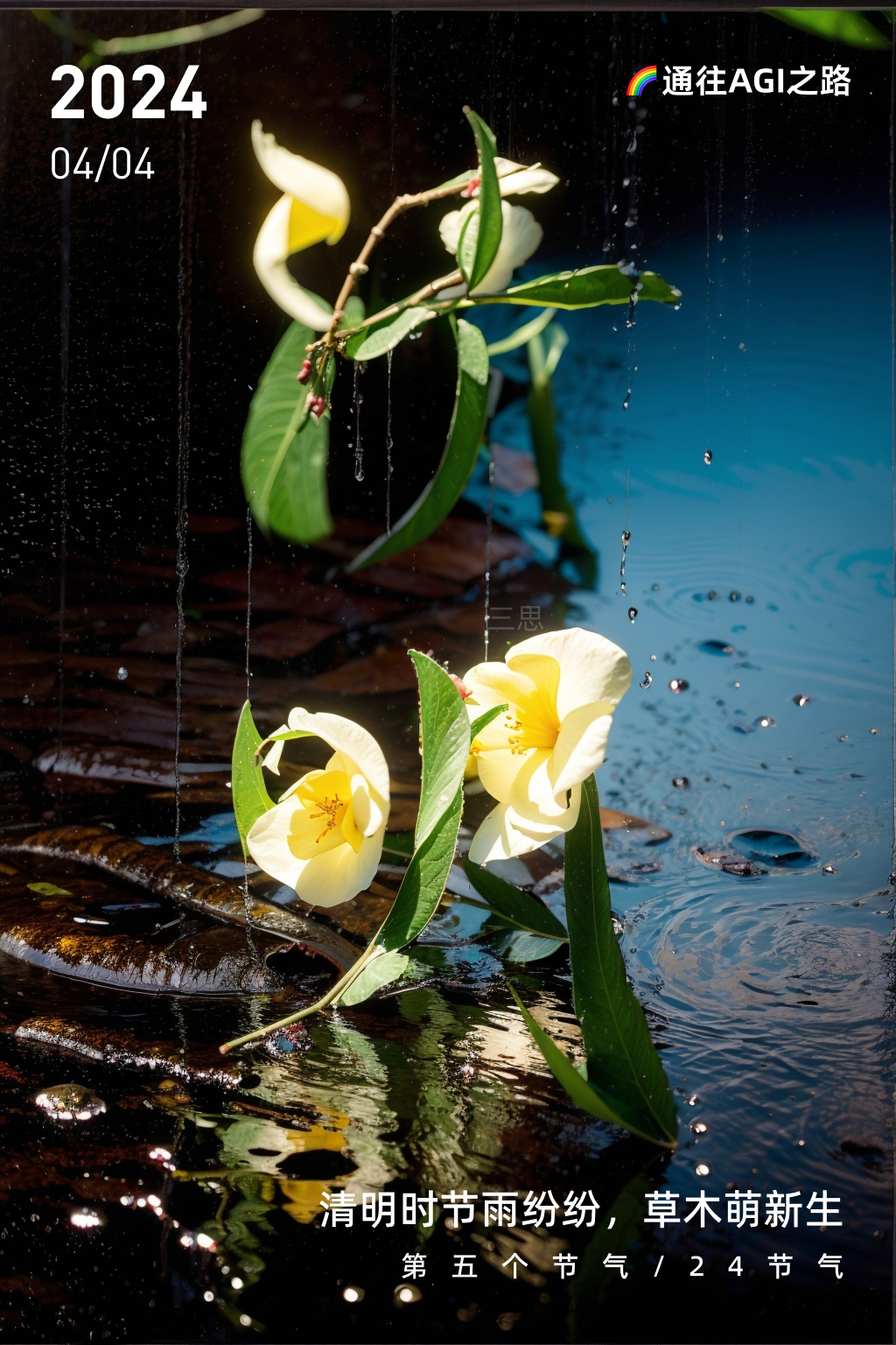 油花(翻译的好像不对劲?),海棠花,杏花。,柳枝,植物,(下雨:1.1),水,倒影,远处的背景是田野,有柳条,没有人类,户外,摄影,模糊,