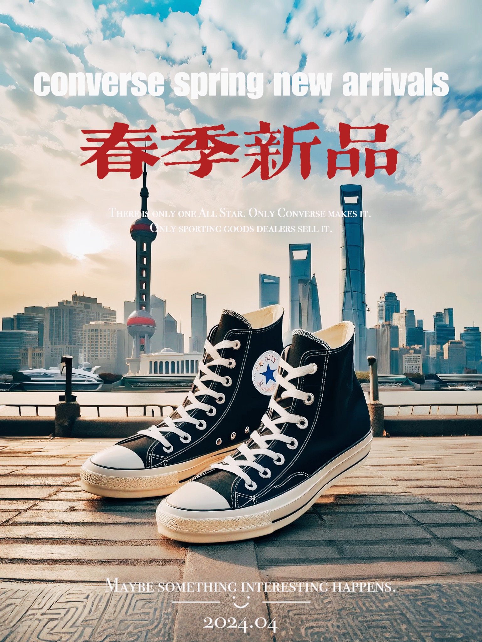 生图关键词:上海老城街头有一双匡威运动鞋,超清晰、摄影感、4K