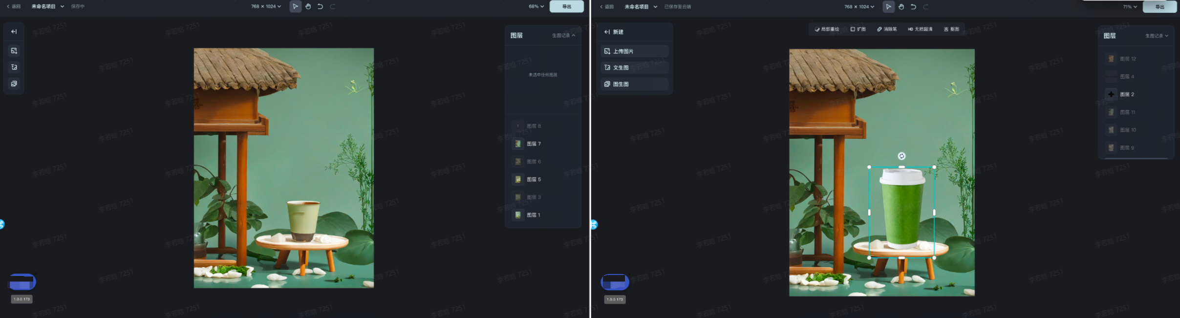 右侧图层可看到4张图,选择喜欢的图即可;如果不喜欢,可用局部重绘、消除笔等功能调整,也可以重新生成。