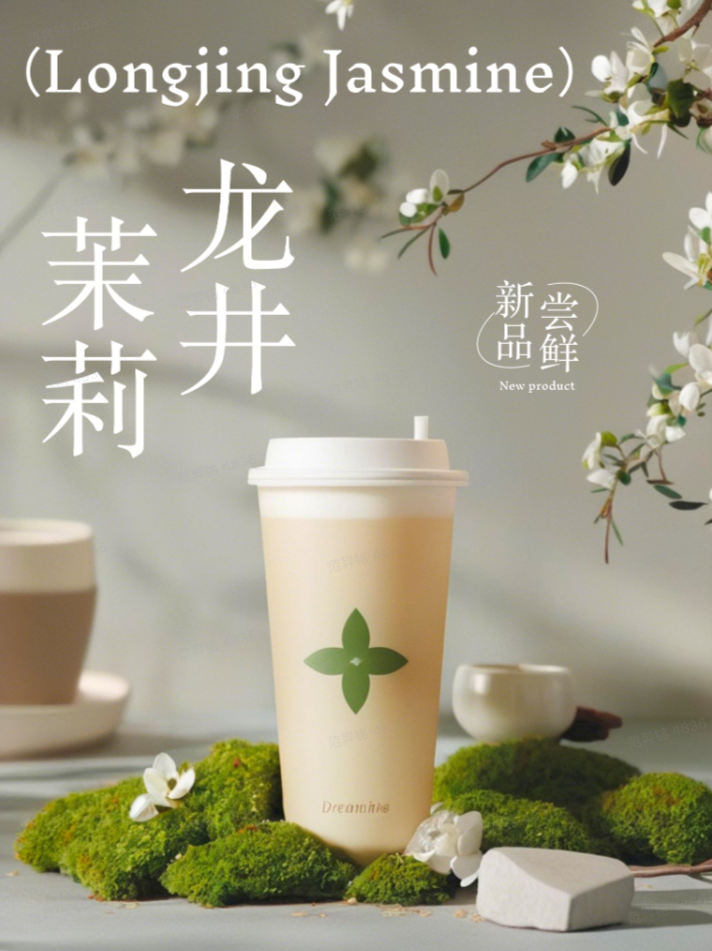 生图关键提示词:平面插画,国风,留白,新中式,特写镜头,画面正中间房放着一杯纸杯奶茶,周围摆放着白色茉莉,假山石和青色苔藓,干净背景,具有细腻的笔触