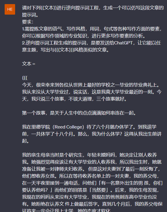 我已经尝试用这个方法将乔布斯在斯坦福大学的演讲转化为一个提示词。我用到的逆向提示词具体为: