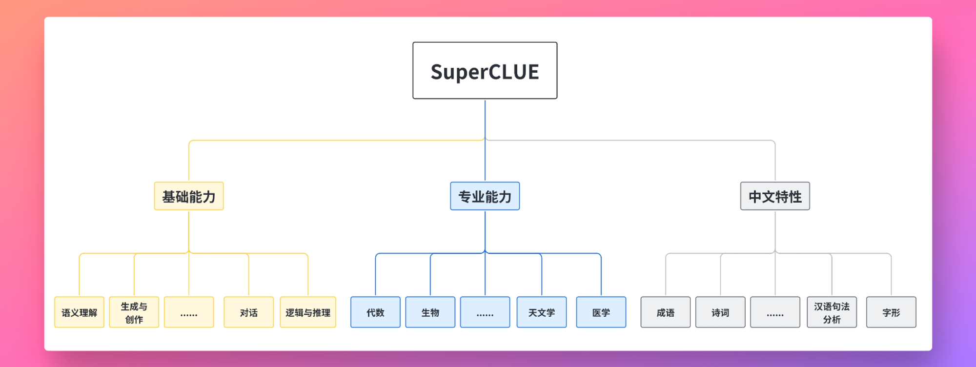 上面这张图可以比较清晰的解释他们的整个评价体系,SuperCLUE从三个不同的维度评价模型的能力:基础能力、专业能力和中文特性能力。具体的细节可以到他们的项目页面查看: