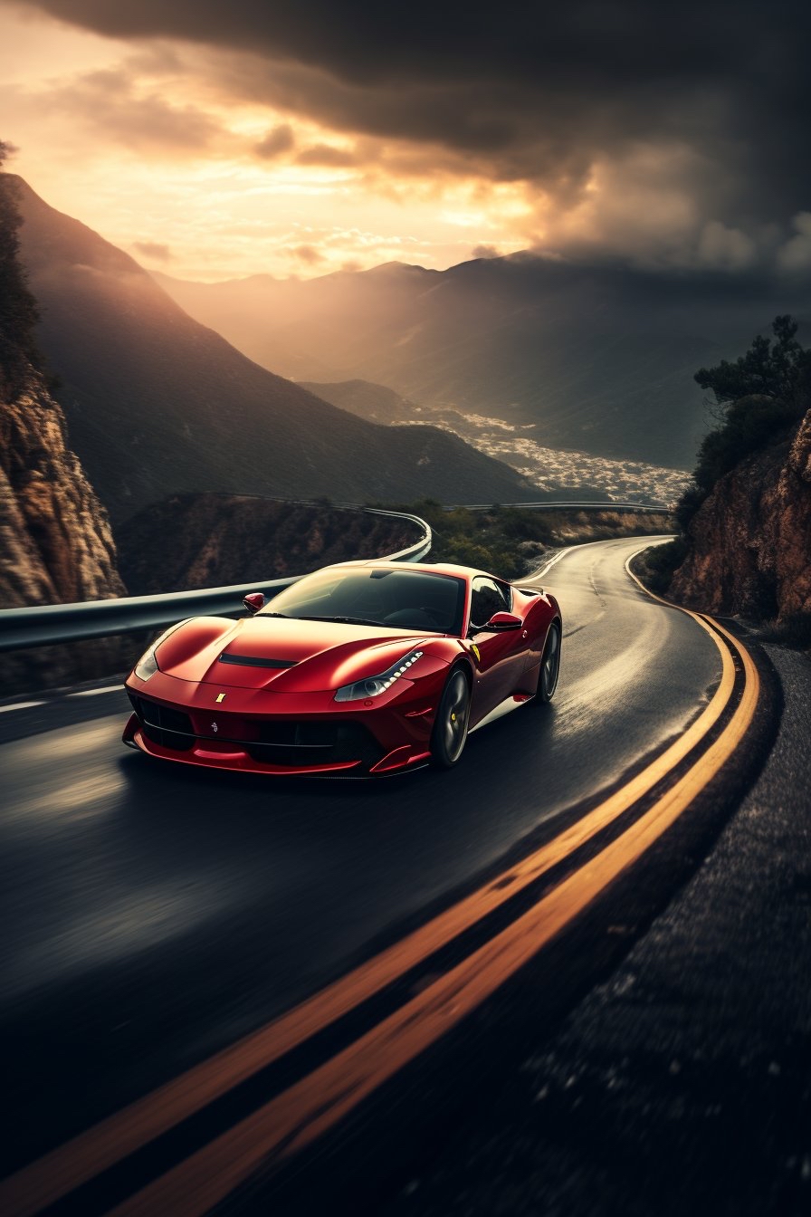a red ferrari speeding down a windy mountain road, stunning details, beautiful lighting