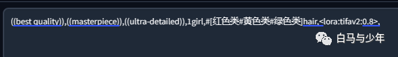 下面这两个框内,可以分别固定正向提示词的开头和结尾,比如我在这里填入一个“高质量,女孩”的开头,和一个tifa的lora作为结尾。这样,无论我怎么替换随机提示词,这些词都不会变。
