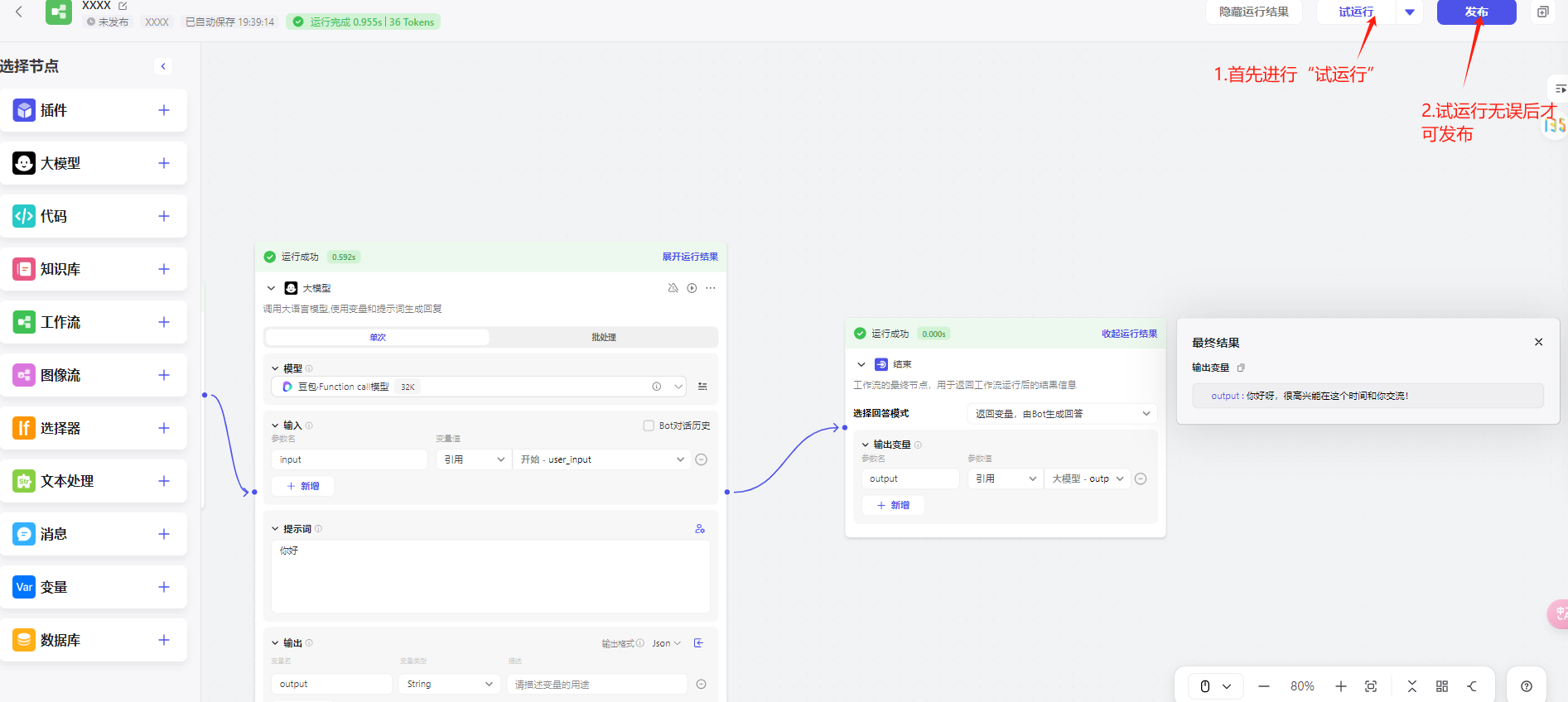 重要的是,无论用户是否主动将操作连接到结束节点,系统都会强制要求在工作流的最后步骤中包含结束节点。只有当整个流程的最终动作指向结束节点时,工作流才能够进行试运行和正式发布。这是确保工作流完整性和功能性的关键步骤。
