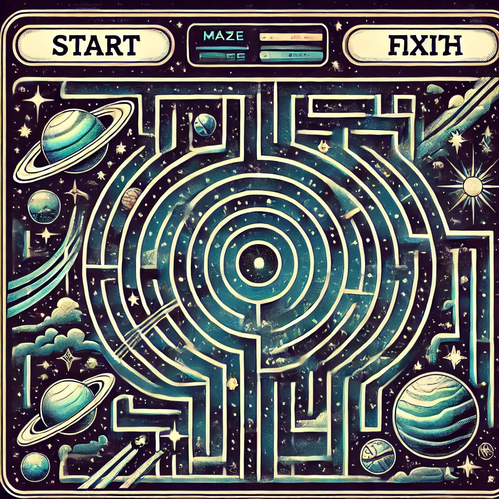你能帮我设计一个宇宙主题的迷宫游戏图吗?要注意图片的内容中要有唯一的入口,唯一的出口,遵循与迷宫游戏的设计理念和设计逻辑。保证图片是平面 2D 的图片。其中迷宫作为主体,用最大的面积展示给用户。