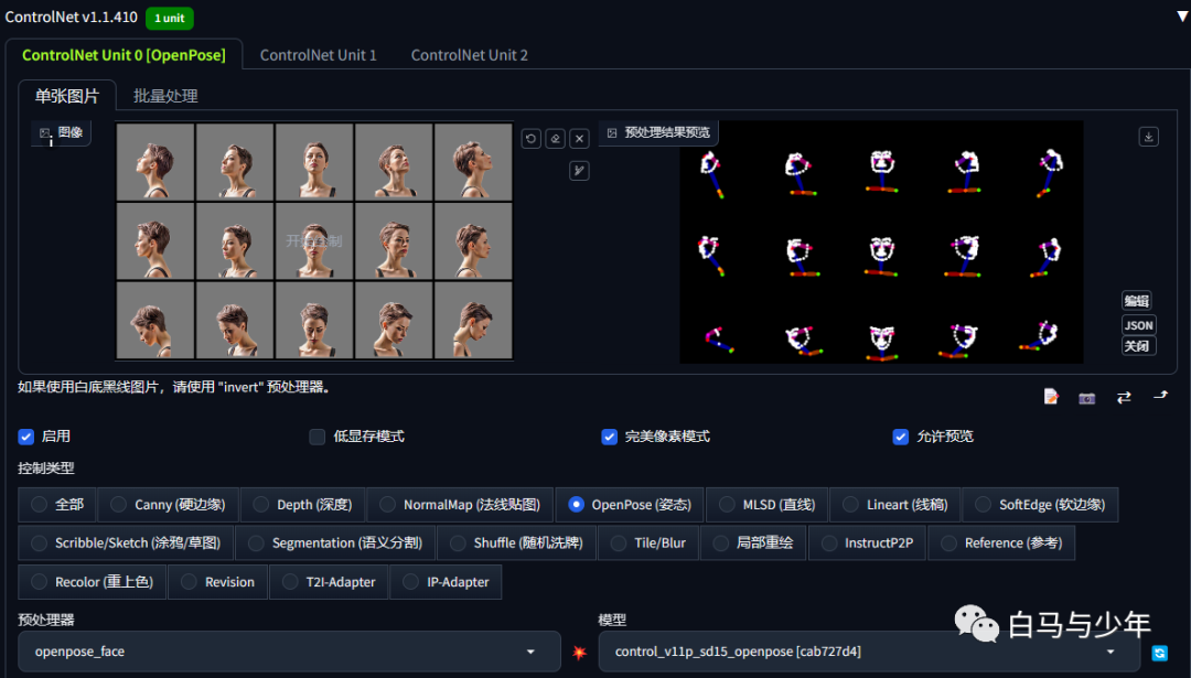 接下来,我们来设置controlnet,第一张图选择openpose_face,得到人物的15个面部角度。